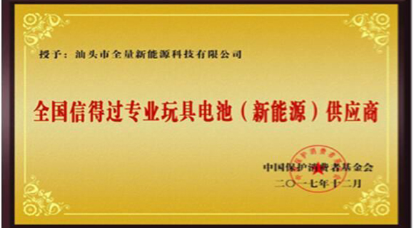 中國商務新聞網(董利君)近日,汕頭市全量新能源科技有限公司被中國保護消費者基金會評為全國信得過專業(yè)玩具電池(新能源)供應商,并授予獎牌。 據悉,全量新能源有限...
